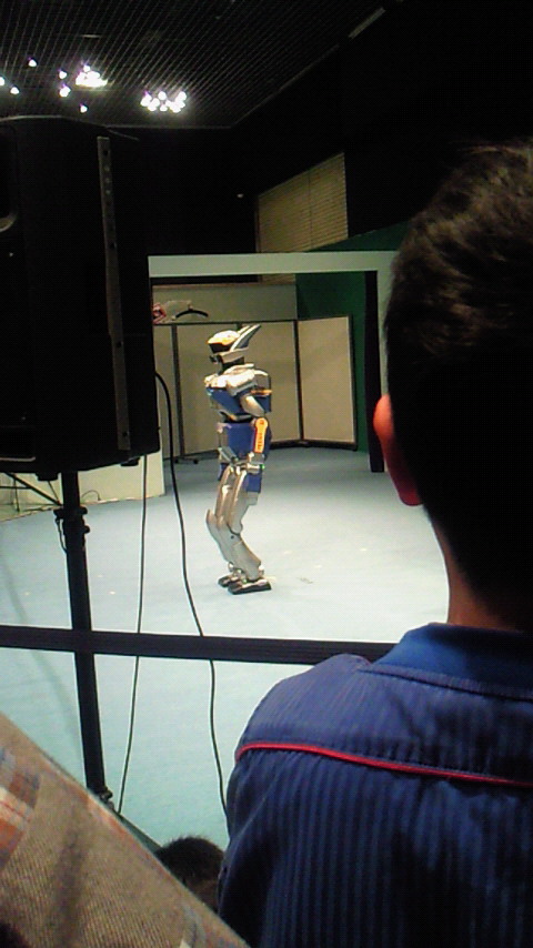 まあ15分くらいで、民謡踊ったり四つんばいで歩いたり、しゃがんで歩いたりするロボットを見てきました。お、面白かった。何が面白いって、実際動くロボットの関節の動きと足の曲がり方。映像で見るより、興味深かったです。ので、写メ(笑)
