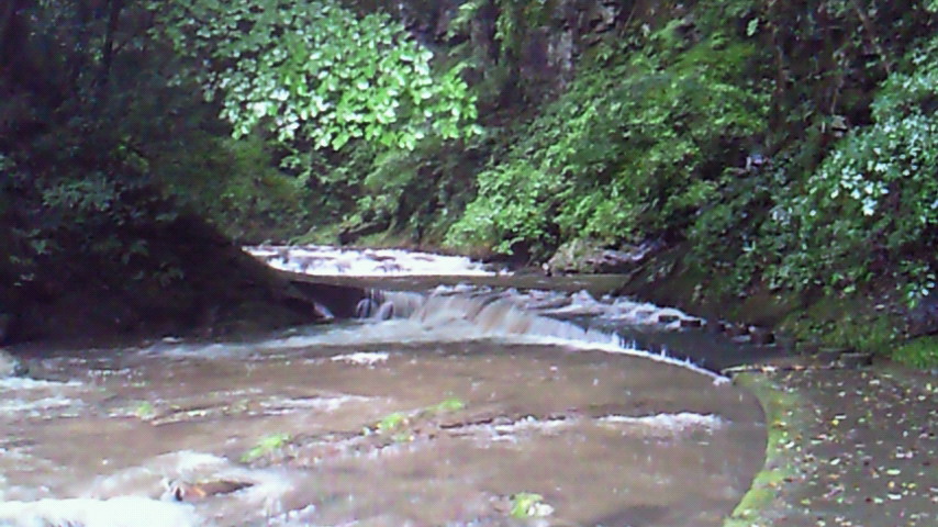 朝、雨の中でも滝まで歩こうと散策し、増水で仲間に止められて先に進めなかった場所が写真です(笑)