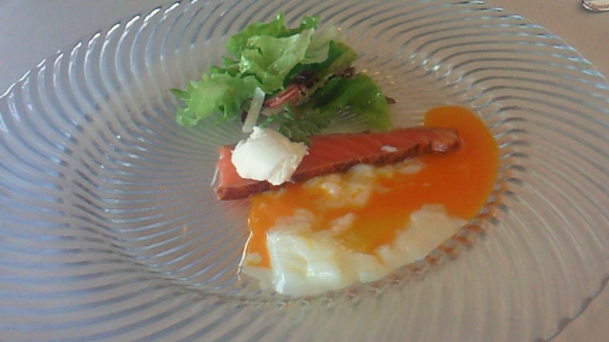 で、やっぱり食べる方に意識がいくので、色々写メは取り逃してばかりなり…はっ、と食べてる途中に思い出して写メってみました(笑)先付けの後の前菜。私の大好物のスモークサーモンの温泉卵つき。というか、サーモン分厚いし、自家製でちゃんとスモークもされてて香りがいいのなんの。